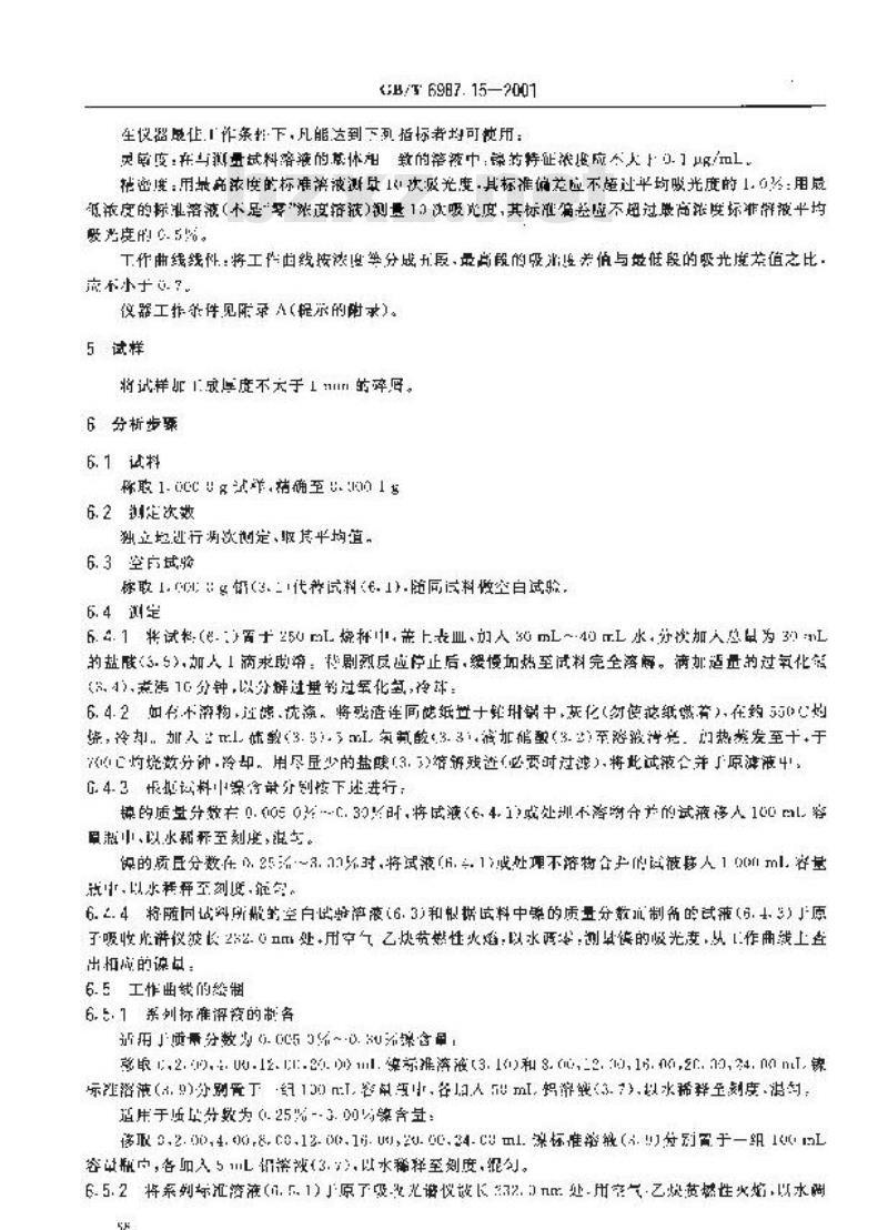 6.4.1将试料(e->于250mL烷样,上表血、加人s0mL~40mL水.芬次加入总品为3mL的盐感3.S),如人1滴来职率:提剧刻反应停正后,慢加燃至试料完全落展,满如适量的过氧化等(%.4,蒸10分钟,以分解过重钓过氧化氢,冷部:6.4.2有千率物注滤洗涤,将码查连同纸十销册钢中,充亿(使范纸缴有)在约动心处绕,冷:加入致3.=m氧或酸3.3疫加(3.2至降污亮,门热蒸发至干于7(心灼烧效分钟.冷却,用尽显少的盐曦13.3)熔矫残迹必要时过涉),将此试策合并了原液4!,G.4-3报抵试料中综策分到核下述进行:操的质量分数有0.(0%0片-C.30时,将成液6.4.1?或处别不咨谢合关的试液移人10mL容鼠、以水和释至刻虚,女。
