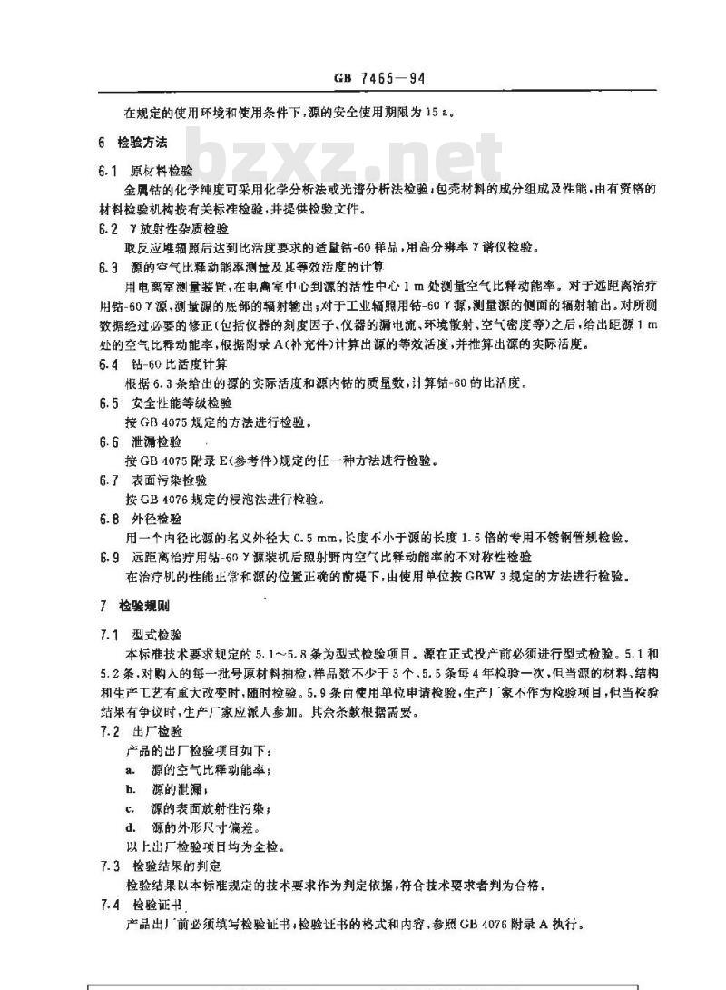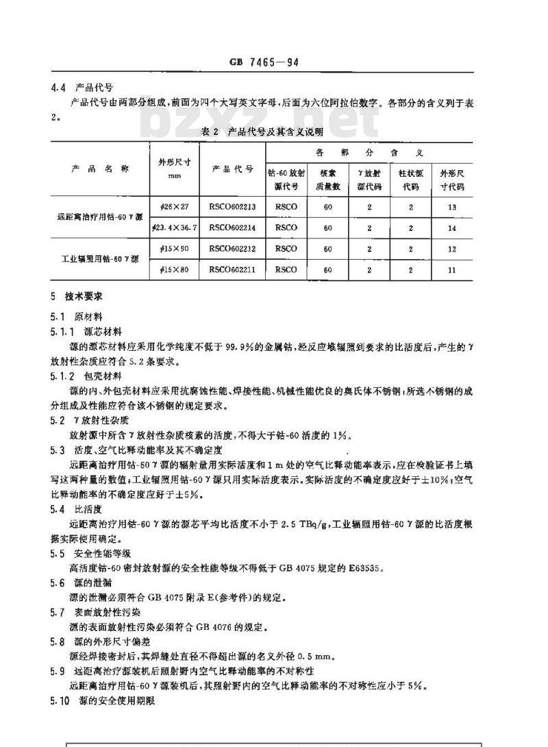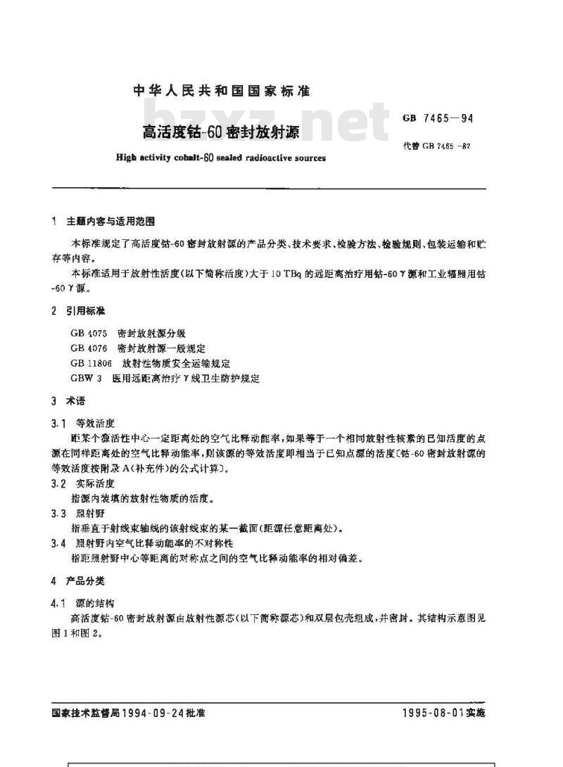 本标准规定了高活度钴-60密封放射源的产品分类、技术要求、检验方法、检验规则、包装运输和贮存等内容。本标准适用于放射性活度大于10TBq的远距离治疗用钴-60γ源和工业辐照用钴-60γ源。 GB 7465-1994 高活度钴-60密封放射源 GB7465-1994