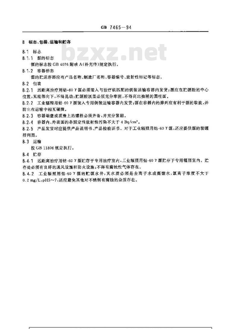B.4.1远距离治疗用钻-60Y源贮存于专用治疗室内,工业辐照用钻-60?源贮存于专用辐照室内。贮存处必须有良好的通风设施和防火设施;不得有腐蚀性气体存在。8.4.2工业辐照用钻-60源的贮源水井,其水质必须是去离子水或蒸馅水,氯离子浓度不大于0.2mg/L,pH5~7,还应避免其他对不锈钢有腐蚀的杂质存在。GB7465—94