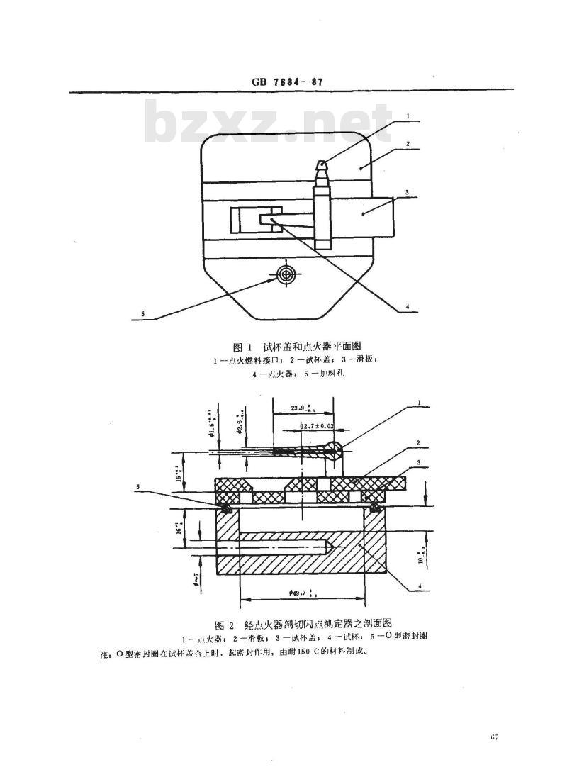 图2经点火器切闪点测定器之剖面图点火器,2一滑板,3—试杯盖,4--试杯,5--0型密封圈注:0型密封圈在试杯盖合上时,起密封作用,由耐150C的材料制成。6