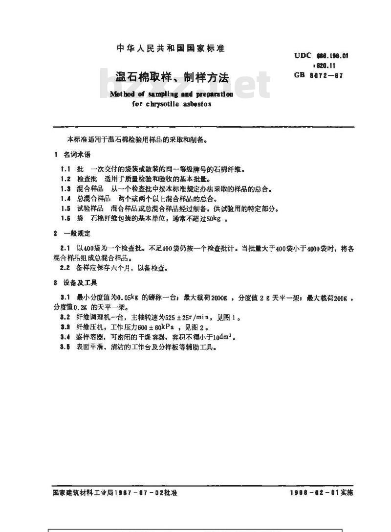 t.1批一次交付的袋装或散装的同一等级牌号的石棉纤维。1.2检查批适用于质量检验和验收的基本批量。1.混合样品从一个检查批中按本标准规定办法采取的样品的总合。1.4总混合样品两个或两个以上混合样品的总合。1.5试验样品混合样品或总混合样品经过制备,供试验用的特定部分。1.6袋石棉纤维包装的基本单位,通常不超过50kg。2一般规定
