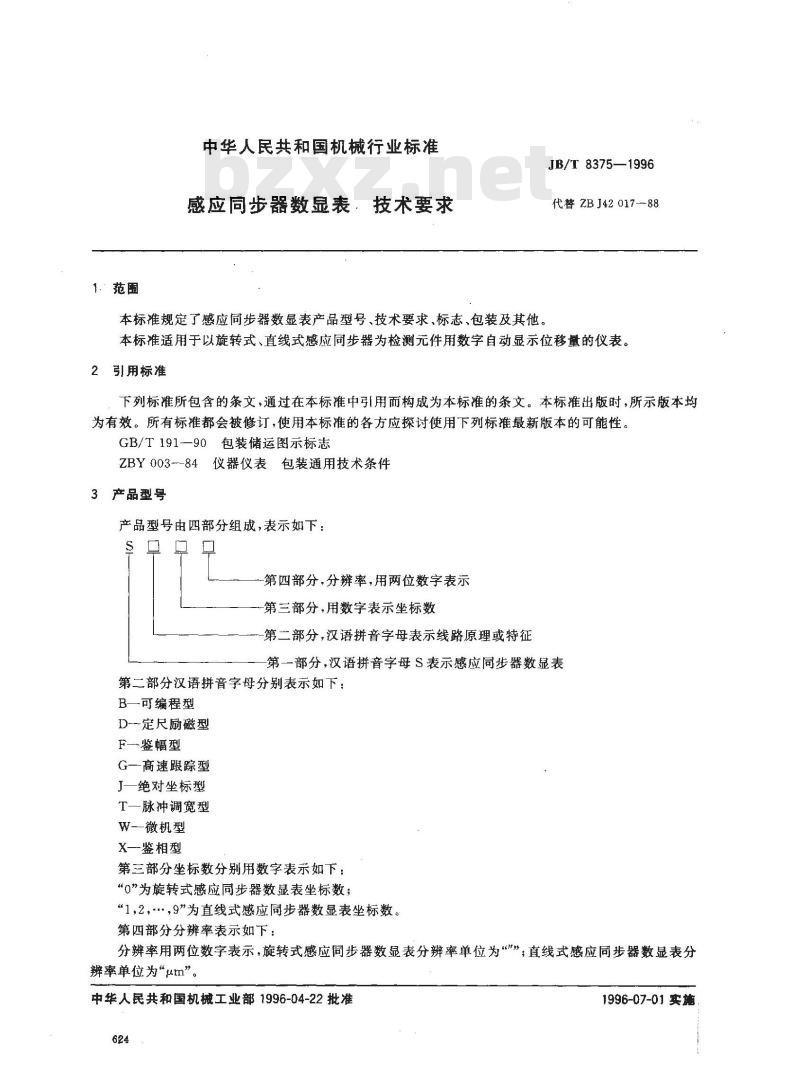 本标准从实施之日起,ZB J42 017-88作废。 本标准在第3章及4.1.3、4.6、4.7、4.11、4.12等均作了些增删,并根据GB 1.3-87的要求,对“标志、包装及其他”作了些修改。 本标准规定了感应同步器数显表示产品型号、技术要求、标志、包装及其他。 本标准适用于以旋转式、直线式感应同步器为检测件用数字自动显示位移量的仪表。 JB/T 8375-1996 感应同步器数显表 技术条件 JB/T8375-1996