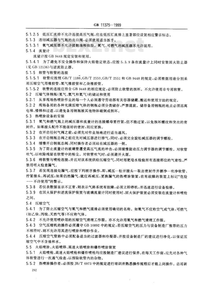 5.1.5.1软管应按照GB/T1186、GB/T2550、GB/T2551和GB9448的规定,必须根据用途分别采用压缩空气用橡胶管,氧气橡胶管和乙炔橡胶管。5.1.5.2软管的连接应符合GB9448的相应规定,必须防止软管的损坏。不允许使用非专用软管。5.2压缩气体钢瓶(氮气、氟气和氨气)的储运和使用5.2.1从事现场热喷涂作业的每一个人必须遵守劳动部有关容器储藏、搬运和使用方法的规定。5.2.2现场备用的各种充满压缩气体的钢瓶必须分类储存,严禁混放。储存备用钢瓶的地点必须远离电梯、楼梯和过道,以避免备用钢瓶被其他物体碰倒或损坏。5.3热喷涂设备的安装