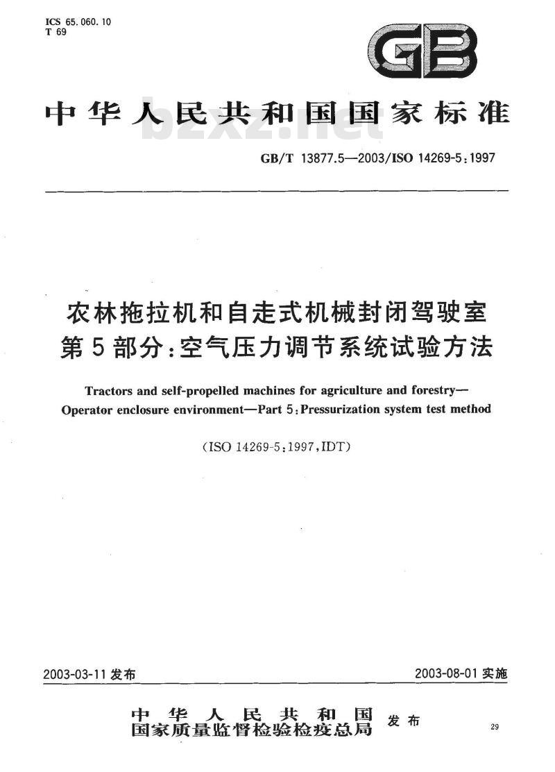 - GB/T 13877.5-2003 农林拖拉机和自走式机械封闭驾驶室 第5部分:空气压力调节系统试验方法