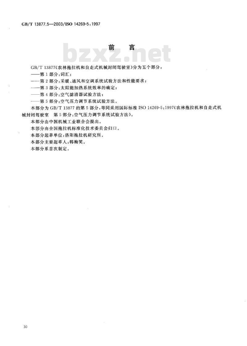 第2部分:采暖、通风和空调系统试验方法和性能要求;-第3部分:太阳能加热系统效率的确定;第4部分:空气滤清器试验方法;第5部分:空气压力调节系统试验方法。本部分为GB/T13877的第5部分,等同采用国际标准ISO14269-5:1997《农林拖拉机和自走式机械封闭驾驶室第5部分:空气压力调节系统试验方法》。本部分由中国机械工业联合会提出。本部分由全国拖拉机标准化技术委员会归口。本部分起草单位:洛阳拖拉机研究所。本部分主要起草人:韩梅笑。