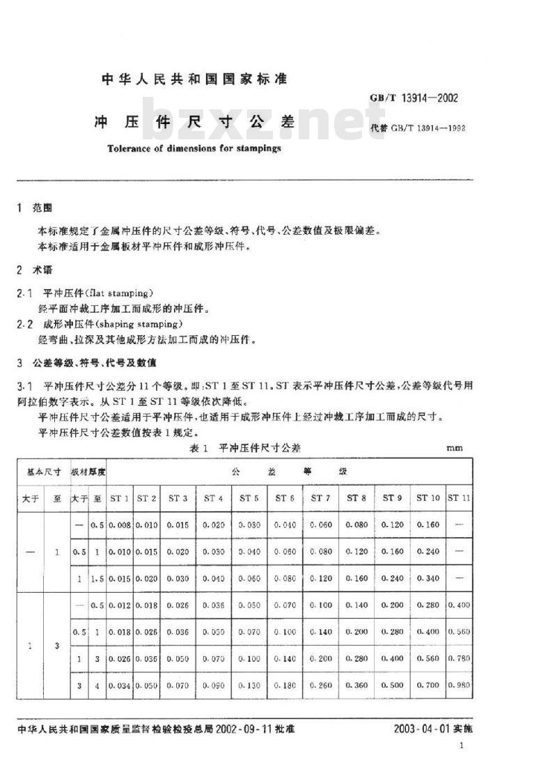 平冲压件、成形冲压件尺寸公差等级选用见附录A(标准的附录)。GB/T13914—2002