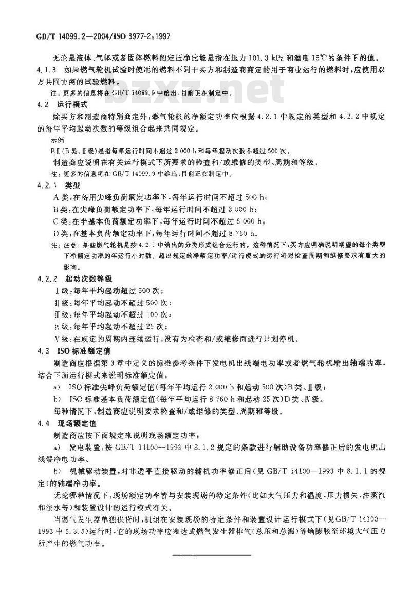 4.通常,在给定的参考透乎进口温度下,燃气轮机翰出功举与绝对天气压功成正比,井耳与空气进口温度有根大关系(通常指室外的干球温度),同样,在给定的空气进口温度下,输出功率与参考透平进口温度有关。为丁获得额定值必须采用标准条件的大气源度和压力·另外由于不的运行模式以及在设计基本部件时采用的准则不同,燃气轮机额定值将仍会大幅变化。ISO标推额定值不计进氧和排气的压降,伯尼现场功率应考您这些损失。往:注蒸汽或注水可用来增加燃气轮机装置出力和减少N,排放。4.1.2燃气轮机的性能额定值应按以下燃料的净比能进行评定a)燃气轮机设计使用液体燃料:42000kJ/kgb)燃气轮机设计使用气体燃料(100%甲烷):50000kl/kg。GB/T 14099.2—2004/1SO 3977-2: 1997无论是液体,气本或者固体燃料的定压净比能是指在是力101.3kPa和温度15的条件下的值,4.1.3如果燃气轮机试验时使用的燃料不尚十买方和制造商商定的用于商业运行的燃料时,应使用双方共同协商的试验燃料。