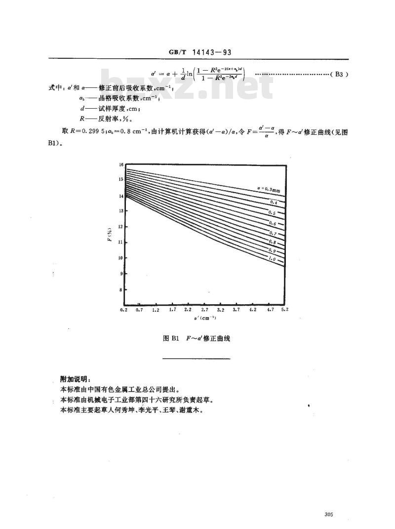 7.1.1对于双面抛光厚度为300~900um的试样,吸收系数α的修正因子F可由附录B查得。7.1.2对于非双面抛光试样,F=0。7.2氧含量的计算: