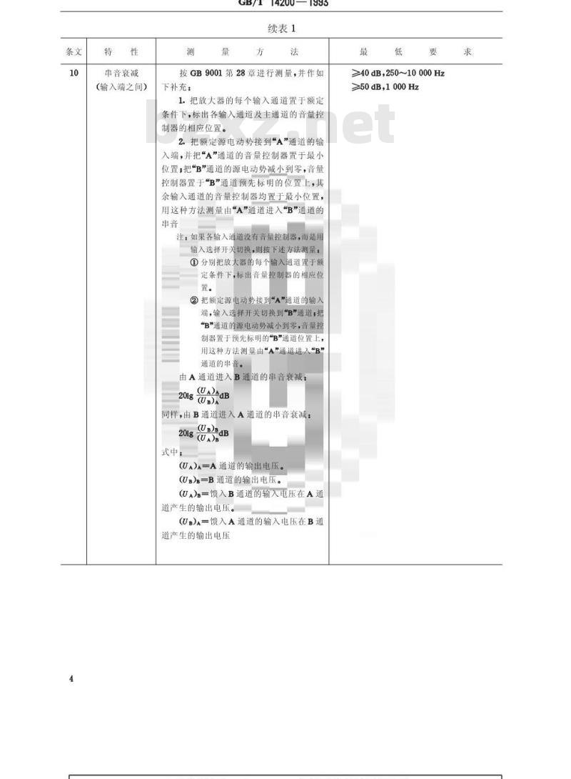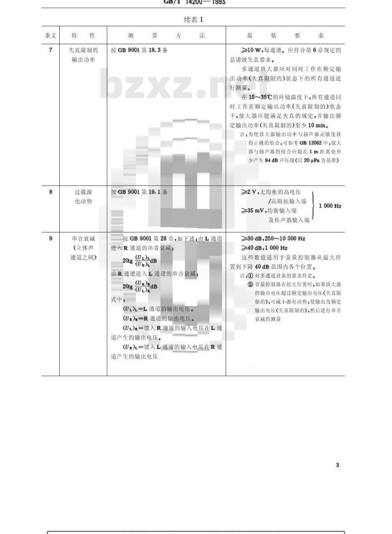 这些数值适用于音量控制器从最大位置到下降40dB范围内各个位置。注,①对多通道设备的要求待定。②音量控制器在较大位置时,如果放大器的输出电压超过额定输出电压(失真限制的),可减小源电动势,使输出为额定输出电压(失真限制的),然后进行串音衰减的测量