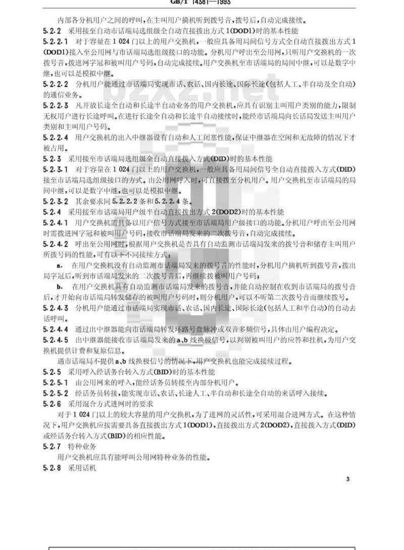 5.2.3采用接至市话端局选组级全自动直接拨入方式(DID)时的基本性能5.2.3.1对于容量在1024门以上的用户交换机,一般应具备用局间信号全自动直接拨入方式(DID)接至市话端局选组级接口的方式。由公用网呼入时,可直接拨至分机用户。用户交换机至市话端局的局间中继,可以是数字中继,也可以是模拟中继。5.2.3.2其余要求同5.2.2.2条和5.2.2.4条。5.2.4采用接至市话端局用户级半自动直接拨出方式2(DOD2)时的基本性能5.2.4.1用户交换机需具备以用户信号方式接至市话端局用户级接口的功能。分机用户呼出至公用网时需拨进网字冠和被叫用户号码,接收市话端局发来的次拨号音,自动完成接续。5.2.4.2呼出至公用网时,根据用户交换机是否具有自动监测市话端局发来的拨号音和储存主叫用户所拨号码的性能,可有以下不同接续方式:a。在用户交换机没有自动监测市话端局发来的拨号音的性能时,分机用户摘机听到拨号音,拨出局字冠后,听到市话端局发来的二次拨号音后,再继续拨被叫用户号码;b.在用户交换机具有自动监测市话端局发来的拨号音,并能自动控制在收到市话端局的拨号音后,才开始向市话端局转发储存的被叫用户号码时,则分机用户,可以不听第二次拨号音而继续拨号。5.2.4.3分机用户能通过市话端局实现市话、农话、国内长途、国际长途(包括人工和半自动)的自动去话呼叫。