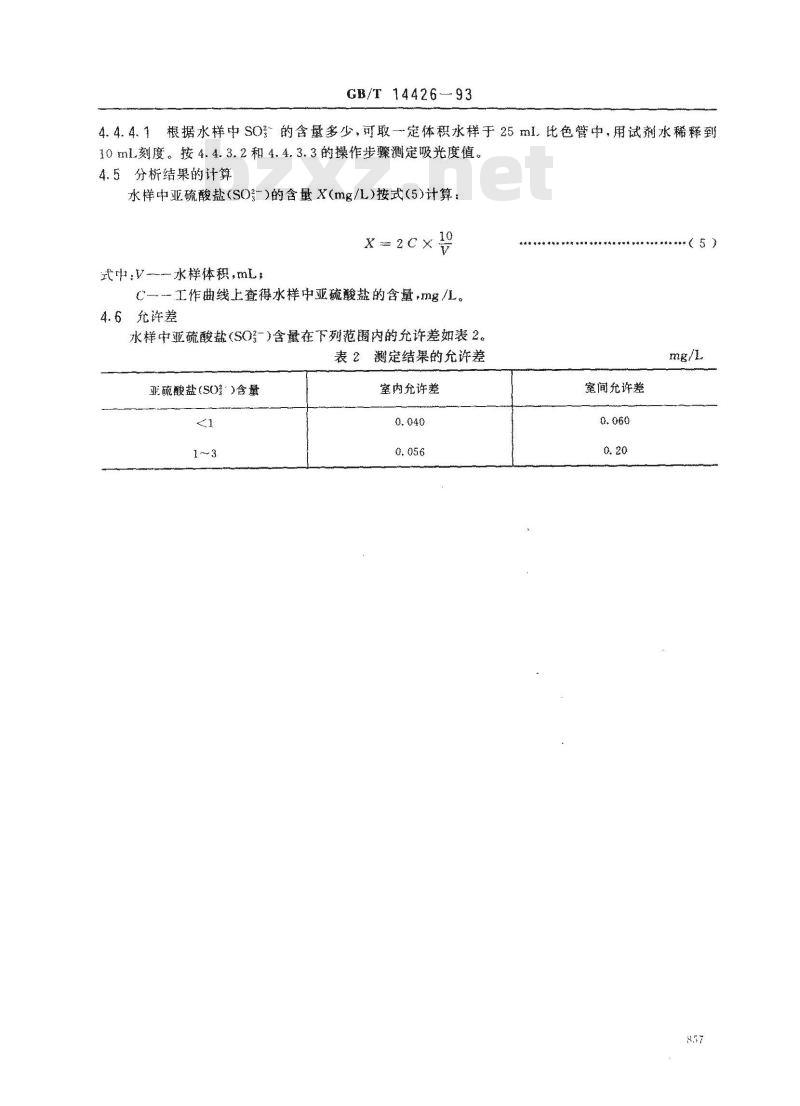 水样中亚硫酸盐(SO-)含量在下范围内的充许差如表2。表2测定结果的允许差