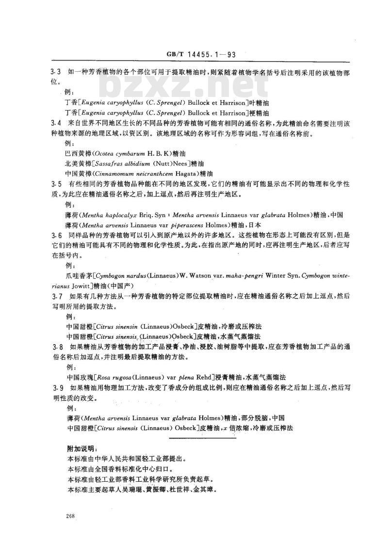 中国甜橙[Citrus sinensin(Linnaeus)Osbeck]皮精油,冷磨或压榨法中国甜橙[Citrus sinensis,(Linnaeus)Osbeck]皮精油,水蒸气蒸馅法3.8如果精油从芳香植物的加工产品漫膏、净油、浸胶、油树脂等中提取,应在芳香植物加工产品的通俗名称后加逗点,并注明最后提取精油的方法。例:www.bzxz.net