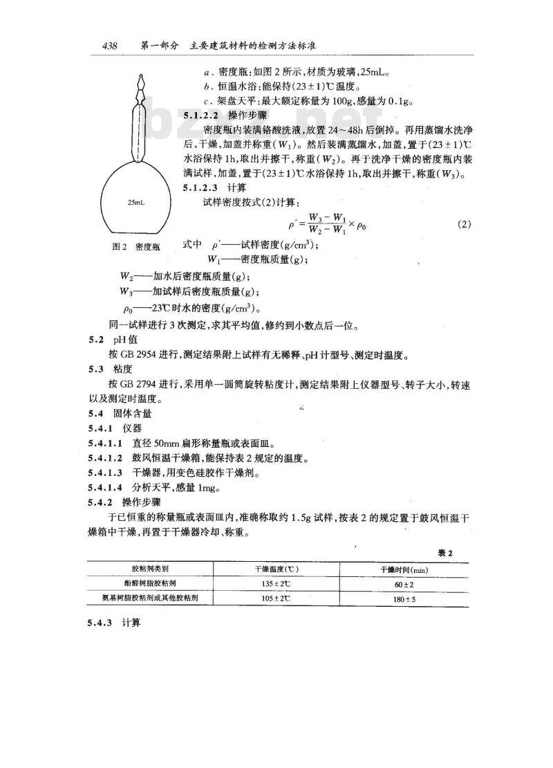 第一部分主要建筑材料的检测方法标准a,密度瓶:如图2所示,材质为玻璃,25mL。b.恒温水浴:能保持(23土1)℃温度。c.架盘天平:最大额定称量为100g,感量为0.1g。5.1.2.2操作步骤