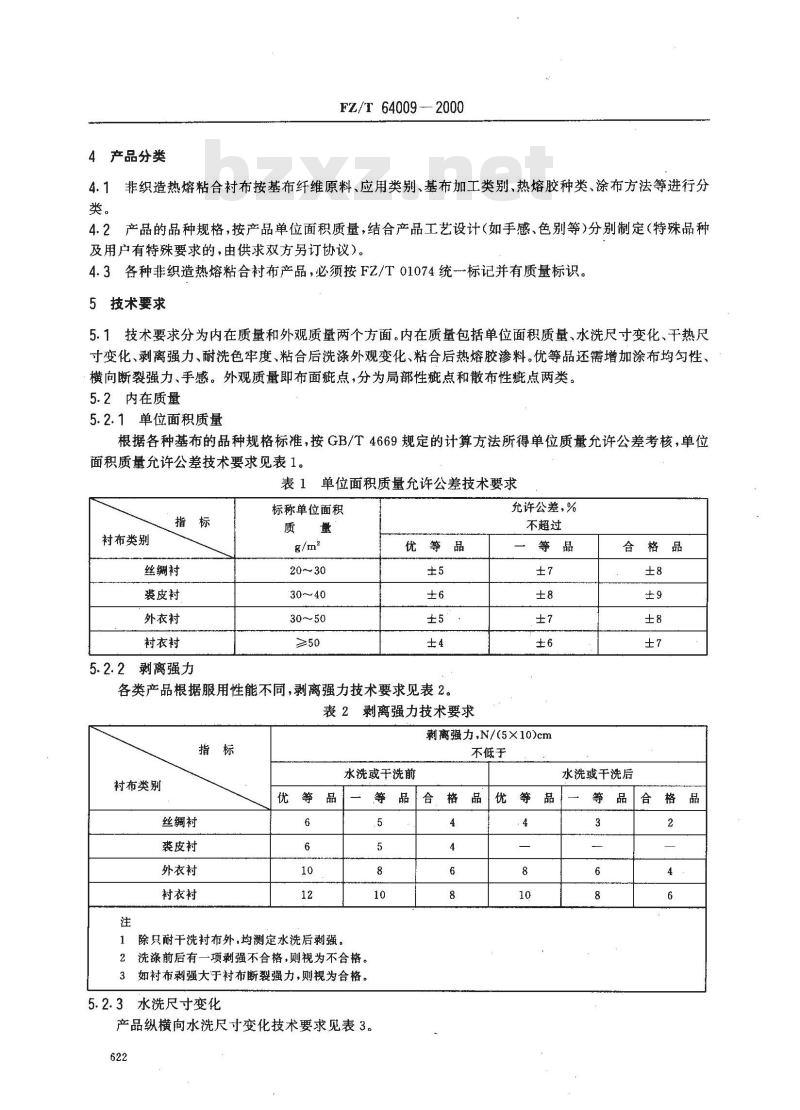 5.1技术要求分为内在质量和外观质量两个方面。内在质量包括单位面积质量、水洗尺寸变化、干热尺寸变化、剥离强力、耐洗色牢度、粘合后洗涤外观变化、粘合后热熔胶渗料。优等品还需增加涂布均勾性、横向断裂强力、手感。外观质量即布面疵点,分为局部性疵点和散布性疵点两类。5.2内在质量