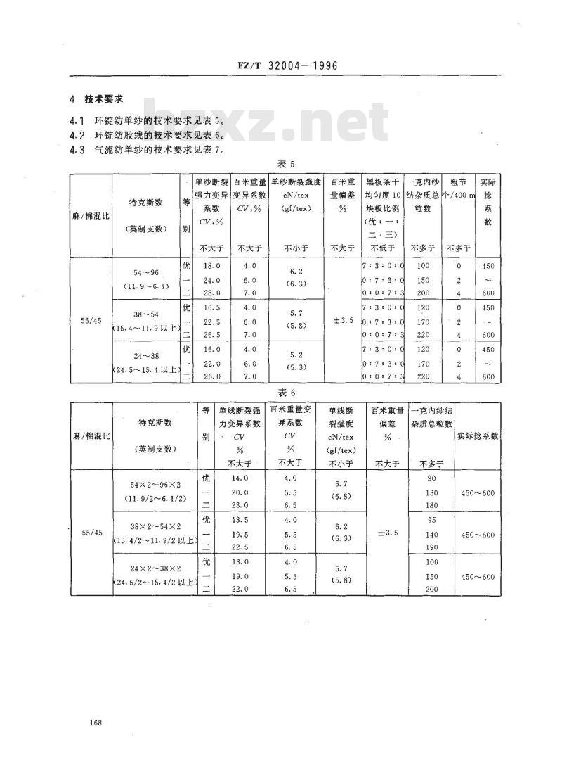 4.1环锭纺单纱的技术要求见表5。4.2环锭纺股线的技术要求见表6。4.3气流纺单纱的技术要求见表7。单纱断裂