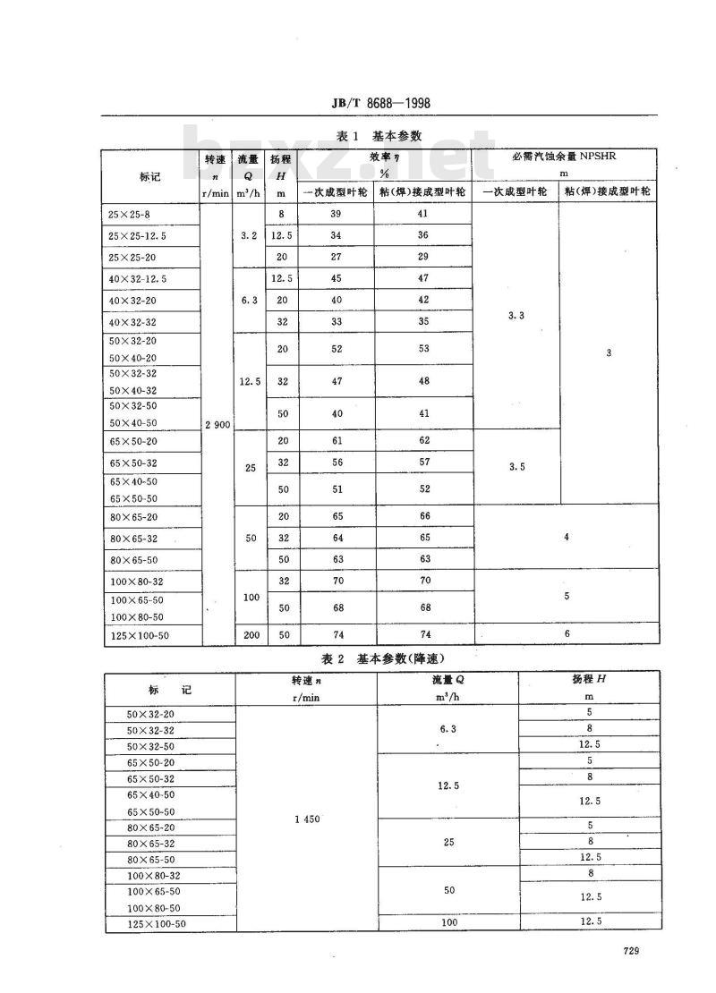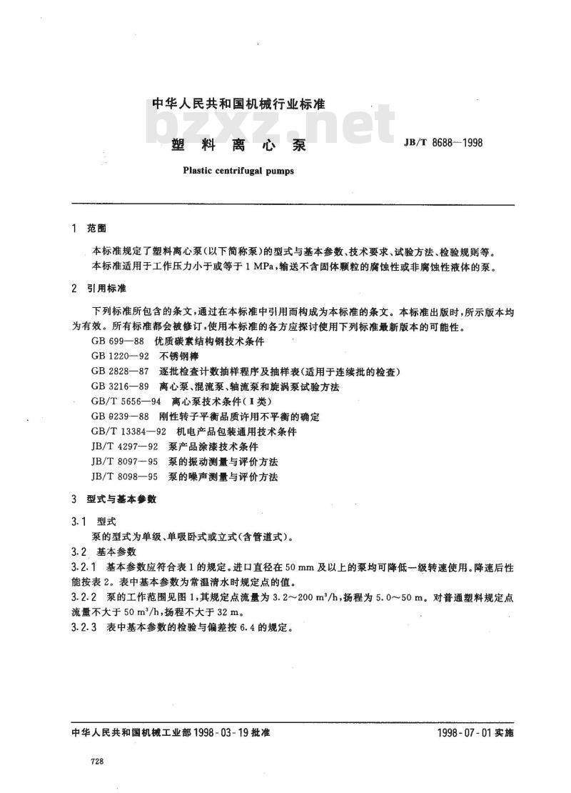 3.2.1基本参数应符合表1的规定。进口直径在50mm及以上的泵均可降低一级转速使用。降速后性能按表2。表中基本参数为常温清水时规定点的值。3.2.2泵的工作范围见图1,其规定点流量为3.2~200m/h,扬程为5.0~50m。对普通塑料规定点流量不大于50m2/h,扬程不大于32m。3.2.3表中基本参数的检验与偏差按6.4的规定。中华人民共和国机械工业部1998-03-19批准728