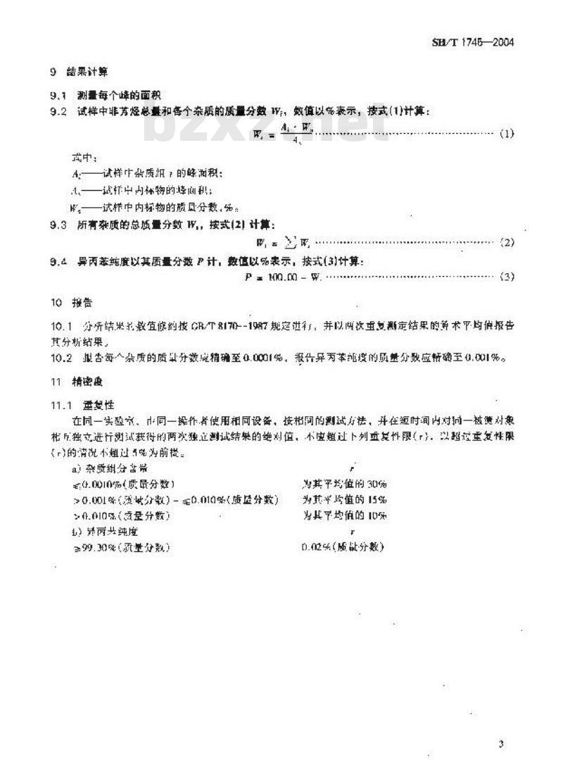 能,试样巾内标物的质且分数,%:9.3研有察质的总质量分数W,按式(2)计算:9,4异苯纯魔以其质量分P计,数值以多表示,按式(3)计算:P 100. - w.