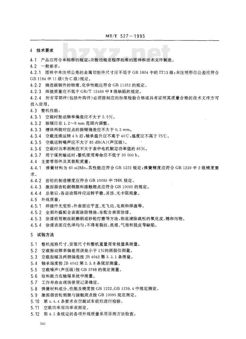 4.3.1空载时振动频率偏差应不大于2.5%。4.3.2振幅应在1.2~8mm范围内调整。4.3.3槽体两侧对应点的振幅偏差应不大于0.5mm。4.3.4空载连续运转4h后,轴承温升应不高于40℃,温度应不高于75℃。4.3.5空载运转噪声应不大于85dBA)(声压级)。4.3.6空载时功率消耗应不大于表中电机额定功率值的85%。4.3.7用于煤炭输运时,整机使用寿命应不低于30000h。4.4主要零部件及其装配质量: