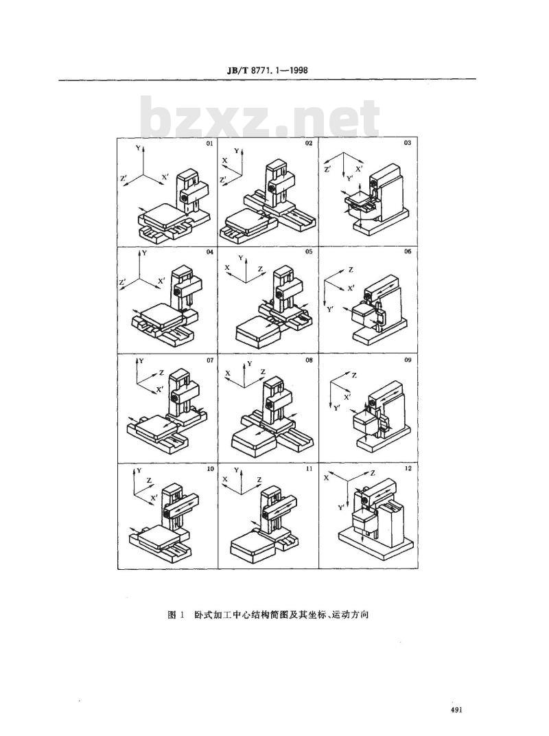 3.6为简明起见,本标准仅附种结构型式的机床简图。3.7对于带有几个托板工作的机床,检验与托板固有几何特性或它们相对于机床轴线的状态有关的项目(G15~G22)时,仅在锁紧在工作位置上的任意一个托板上进行,除非在书面协议上另有规定。3.8当软件设备能补偿某些几何偏差时,相关的检验项目可以按制造厂和用户的协议,在用或不用这些补偿的情况下进行检验。当使用软件补偿时,应在检验结果中标明。3.9机床的坐标和运动方向按JB3051的规定,图1包含了显示部件沿三坐标线性轴线运动的卧式加工中心的12种不同结构型式及其坐标、运动方向的示例。利用从01到12的数字来标志这些结构型式,它们的分类见表1。