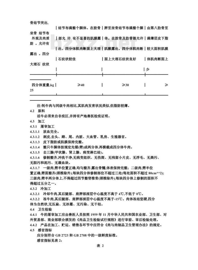 4.3.2.1冷却牛肉,其后腿部、肩部深层中心温度不高于4℃,不低于0℃。4.3.2.2冻牛肉,其后腿部、肩脚部深层中心温度不高于-15℃。肉体冻结坚硬,四分体为自然状,无压扁、无冰霜、无污染、无干枯。4.4卫生检验