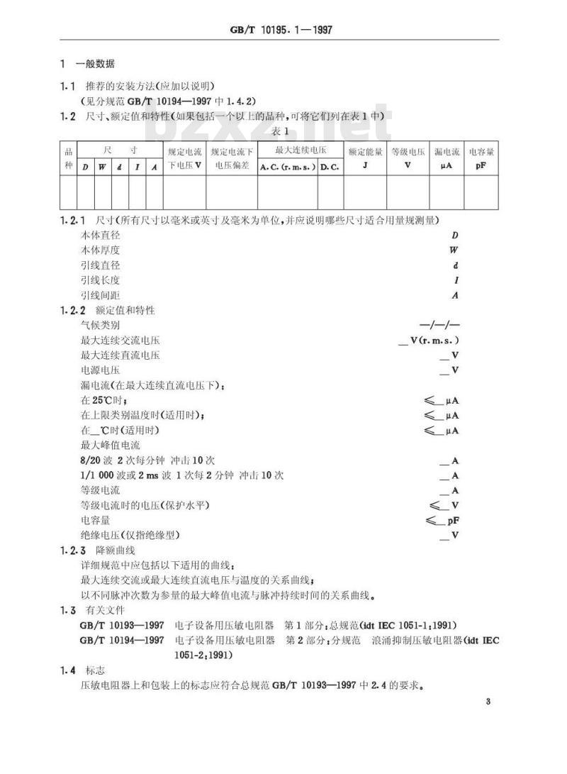 (6)典型结构的信息(适用时)。注:当压敏电阻器的设计不是用于印制电路板时,详细规范的这个位置上应明确指出。(7)带有关系到互换性的主要尺寸的外形图,和(或)引用的国家的或国际的关于外形方面的文件。另一种方法,该图形可在详细规范的附录中给出。(8)用途或涉及的应用类型和(或)评定水平。注:详细规范中采用的评定水平(或几个评定水平),应从分规范3.3.3中选择,这意味着只要试验的编组不变,几个评定水平可以共用一个空白详细规范。(9)关键特性的标准数据,以便在各种型号的压敏电阻器之间进行比较。国家技术监督局1997-12-09批准1998-09-01实施