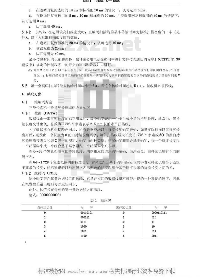 对于在4.2条中叙述的选用的二维编码方案,全编码扫描线定义为数据码(DATA)加上所需的填充码(FILL)、线终码(EOL)以及一位特性码的比特数总和。为了适应各种记录方法,除了标准的20ms以外,还可任选几种最小的全编码扫描线时间。3.1全编码扫描线的最小传输时间应符合以下规定:3.1.1方案1,全编码扫描线的最小传输时间在标准扫描密度和选用的较高扫描密度时都相同。a.建议标准为20ms;