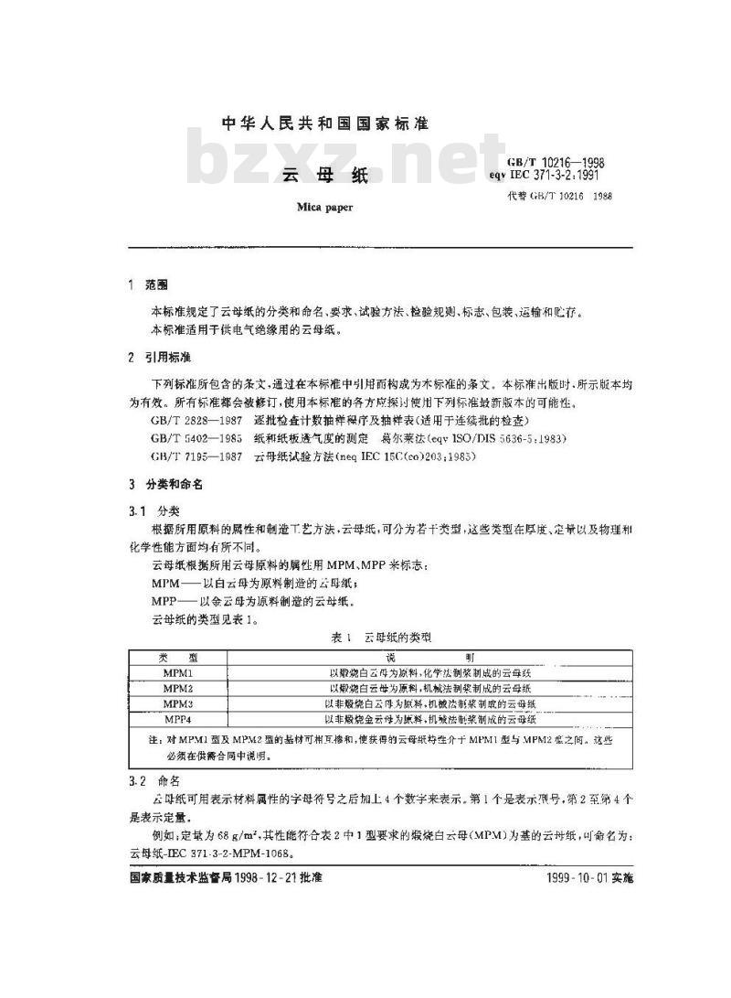 例如:定量为68g/m,其性能符合表2中1型要求的搬烧白云母(MPM)为基的云母纸,可命名为:云母纸-IEC 371-3-2-MPM-1068。国家质量技术监督局1998-12-21批准1999-10-01实施