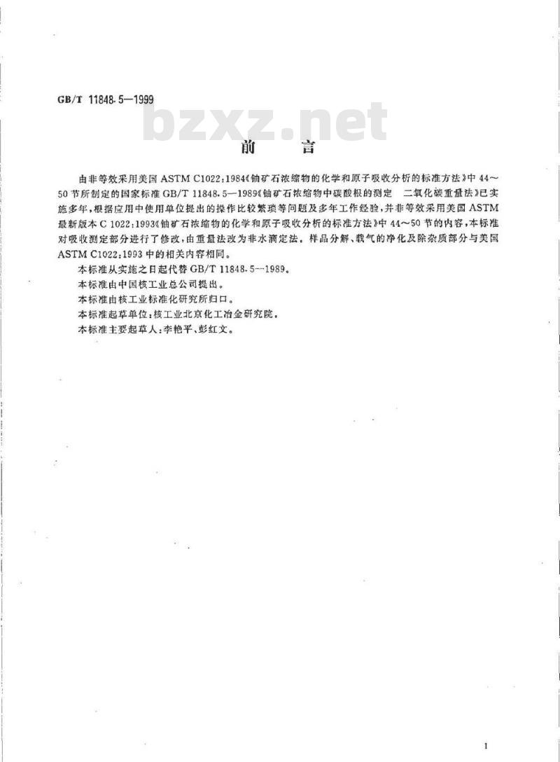 由非等效采用美国ASTMC1022:1984《铀矿石浓缩物的化学和原子吸收分析的标准方法》中44~50节所制定的国家标准GB/T11848.5—1989矿石浓缩物中碳酸根的测定二氧化碳重量法》已实施多年,根据应用中使用单位提出的操作比较繁琐等问题及多年工作经验,并非等效采用美国ASTM最新版本C1022:1993《铀矿石浓缩物的化学和原子吸收分析的标准方法》中4450节的内容,本标准对吸收测定部分进行了修改,由重量法改为非水滴定法。样品分解、载气的净化及除杂质部分与美国ASTMC1022:1993中的相关内容相同。本标准从实施之日起代替GB/T11848.5-1989。本标准由中国核工业总公司提出。本标准由核工业标准化研究所归口。本标准起草单位:核工业北京化工治金研究院。本标准主要起草人:李艳平、彭红文。1范围