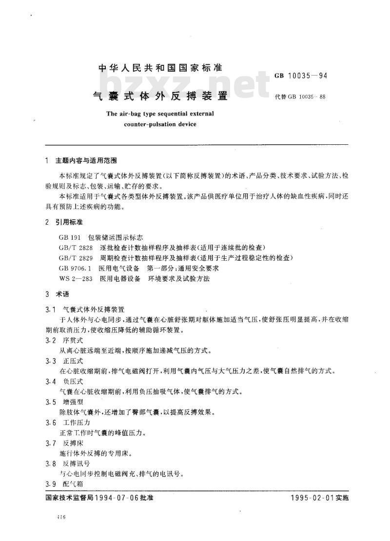 本标准规定了气囊式体外反搏装置的术语、产品分类、技术要求、试验方法、检验规则及标志、包装、运输、贮存的要求。本标准适用于气囊式各类型体外反搏装置。该产品供医疗单位用于治疗人体的缺血性疾病,同时还具有预防上述疾病的功能。 GB 10035-1994 气囊式体外反搏装置 GB10035-1994