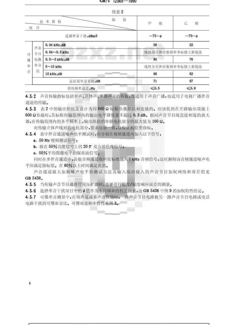 4.3.3表2中的输出阻抗是设计为同600Q标称负载阻抗相连接的。应该低到在开路输出端接上600Q负载时,其标称传输范围内的输出电平降低量不超过0.3dB。拟同声音节目线直接相连的放大器,在传输范围内的各个频率上,输出阻抗的串联电抗部分的最大值为1002。对传输立体声线对的电抗部分,要求尽量一致,以保证相位差指标。4.3.4表中伴音通道噪声电平测试时,应分别在视频通道内加入以下信号:a.50Hz视频测试信号