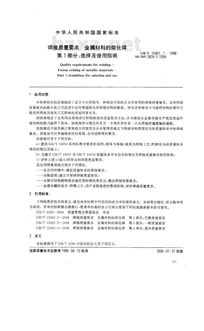 - GB/T 12467.1-1998 焊接质量要求 金属材料的熔化焊 第1部分:选择及使用指南