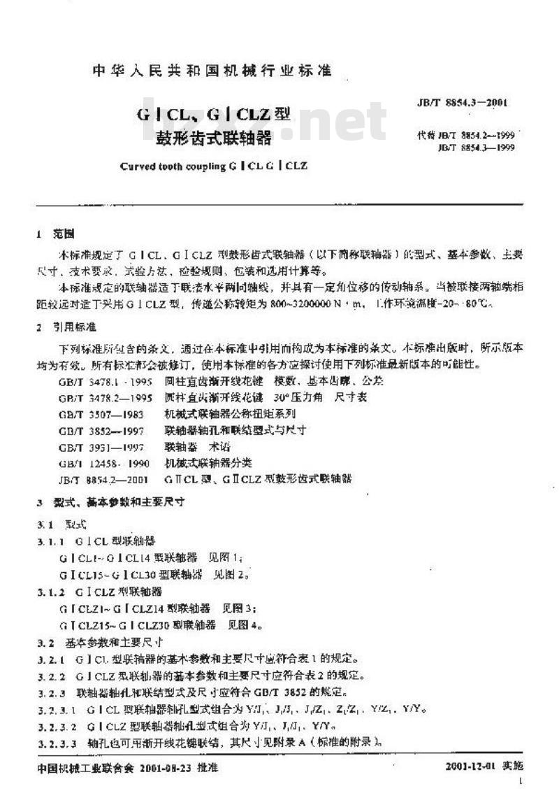 - JB/T 8854.3-2001 GⅠCL、GⅠCLZ型鼓形齿式联轴器