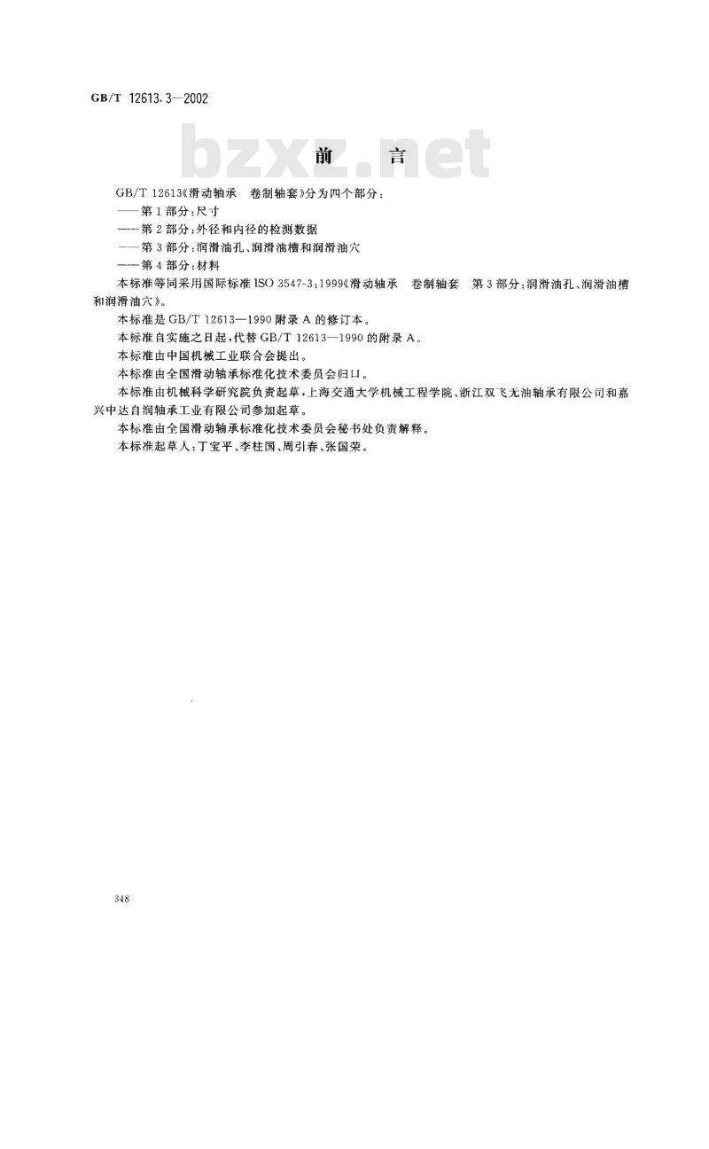 本标准是GB/T12613—1990附录A的修订本。本标准自实施之日起,代替GB/T12613—1990的附录A。本标准由中国机械工业联合会提出。本标推由全国滑动轴承标准化技术委员会归口,本标准由机械科学研究院负贵起草,上海交通大学机械工程学院、浙江双飞无油轴承有限公司和嘉兴中达自润轴承工业有限公司参加起草。本标准由全国滑动轴承标准化技术委员会秘书处负责解释。本标准起草人:丁宝平、李柱国、周引春、张国荣。348