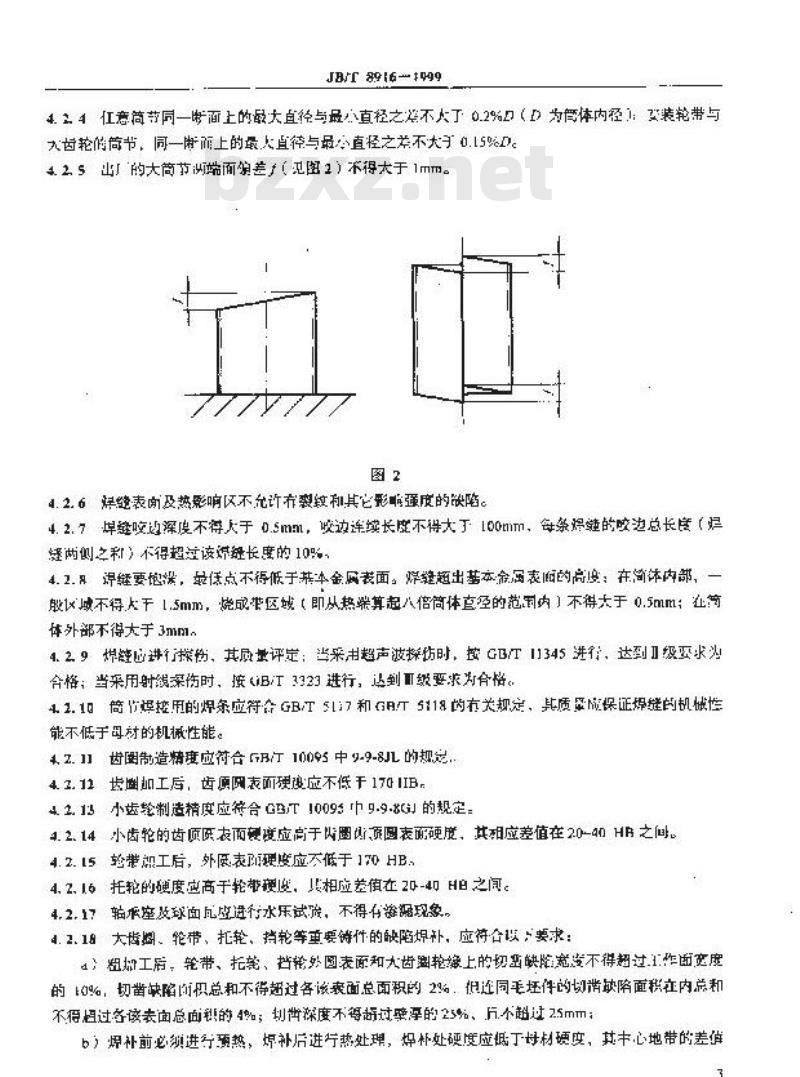 4.Z.11齿阅傲造精班应符合GB10095中9-9-8L的规定4.2.11齿虚加工后,齿原网表而硬度应不低干170IIB4.2.13小齿轮制造精度应符合GB/T100959.9-8G的规定:4.2.14小齿轮的齿质质表而塑度应高于必圈出页圆表需硬度,其应差值在20-40HR之间4.2.15轮带部工后,外底表硬度应不低于170HB.4.2、16托轮的硬度高于轮带硬速,儿相应差值在20-40H白之闻间。4.2.17轴求痒及球面瓦空逆行水乐试破,不得游混现象,4.2.18大齿阖。轮带、把轮、挡轮等重要铸件的缺陷焊补,应符合以一要求:)粗如工后,轮带、托转,挡轮外国表面和大齿测轮缘上的切西缺能宽发不得超过1作面宽度的10%,切凿缺陷的总和不得超过各该表面总面积的2%,但连同毛轻件的切带缺陷面积在内总和不得粗过各该表面总面租的4%;划世深度不得起过壁厚的25%、片不超过25mm;b)焊补前必须进行预势,短补后进行处理,炽朴处硬度应低丁母材硬度,其中心地带的差催3