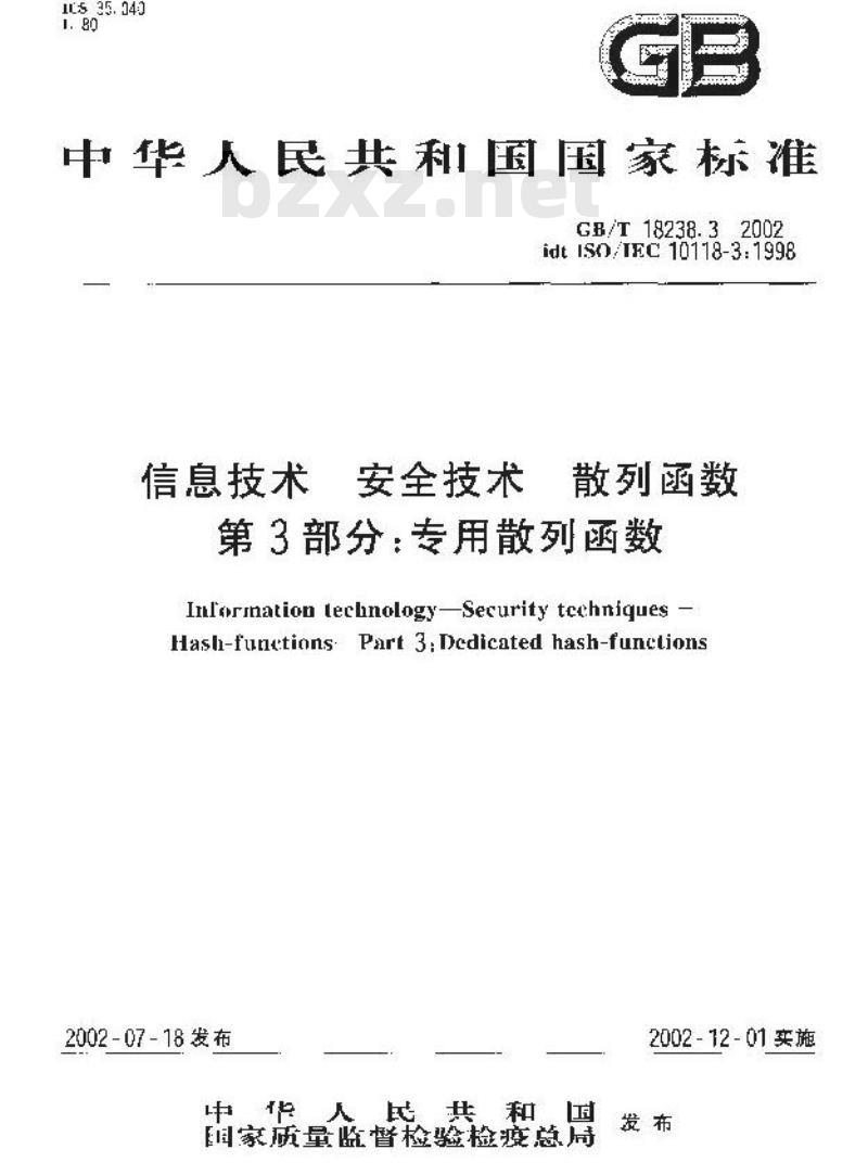 Inforrnation lechnology-Security tcehniques -Hash-funations: Part 3:Dedicated hash-functions2002-07-18发布