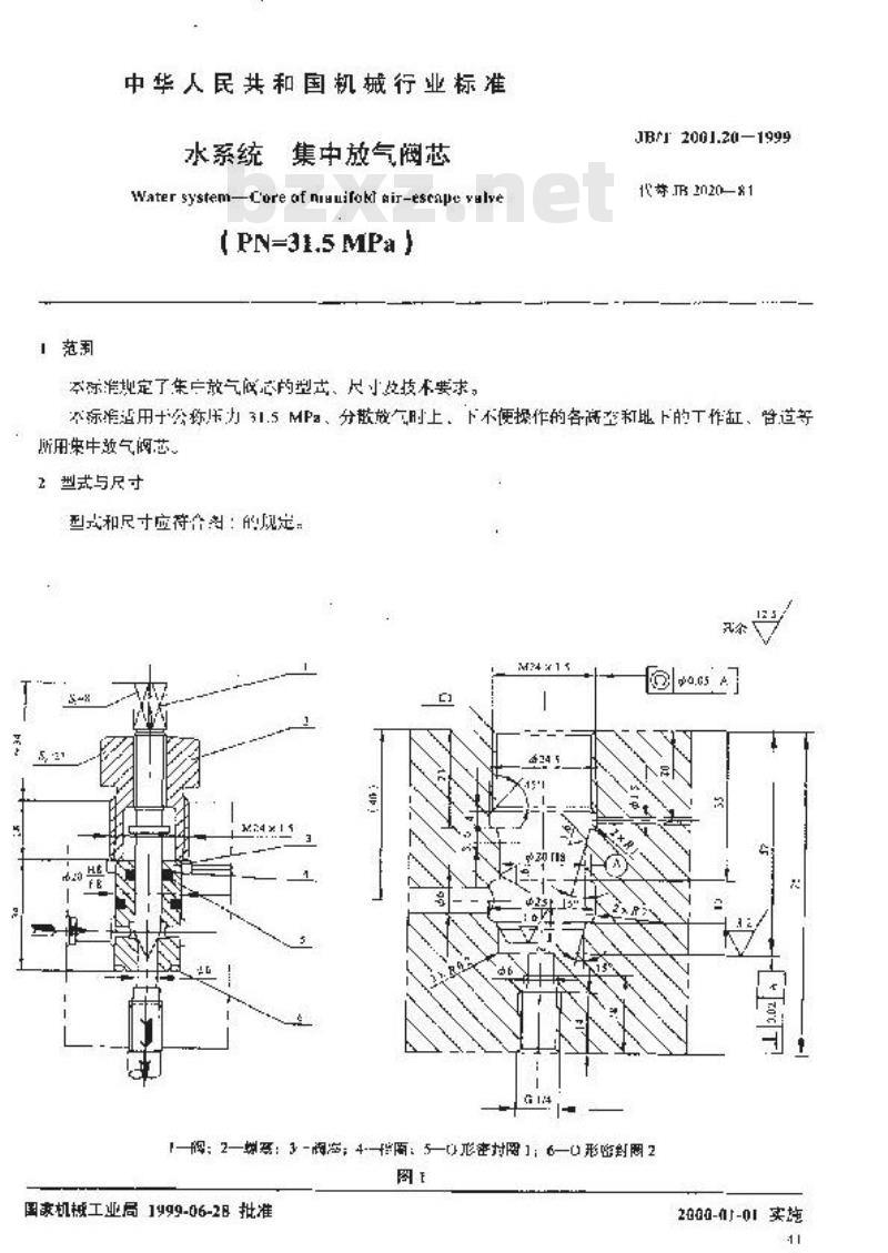 JB/T 2001.20-1999 本标准是对 JB 2020-84《水压机 集中放气阀芯(Pg=315×100000Pa)》的修订。 本标准规定了集中放气阀芯的型式、尺寸及技术要求。 本标准适用于公称压力 31.5MPa、分散放气时上、下不便操作的各高空和地下的工作缸、管道等所用集中放气阀芯。 本标准于 1984 年月日首次发布。 JB/T 2001.20-1999 水系统 集中放气阀芯(PN=31.5MPa) JB/T2001.20-1999