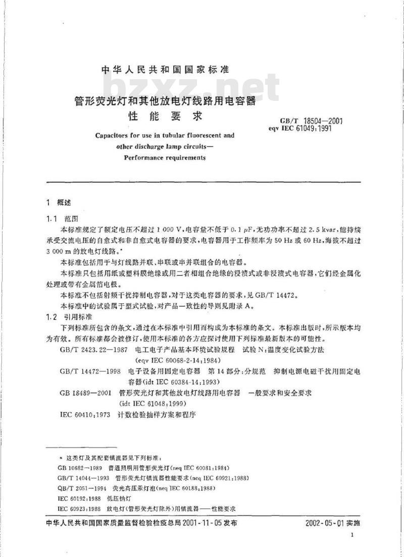 本标准规定了额定电压不超过1000V,电容量不低于0.1μF,无功功率不超过2.5lvar,能持续承受交流电压的自愈式和非自愈式电容器的要求,电容器用于工作频率为50Hz或60Hz,海拔不超过3000m的放电灯线路。本标准包括用于与灯线路并联、串联或串并联组合的电容器。本标准只包括用纸或塑料膜绝缘或用二者相组合绝缘的浸渍式或非浸渍式电容器,它们经金属化处理或带有金属箔电极。本标准不包括射频干扰抑制电容器,对于这类电容器的要求,见GB/T 14472。本标准中的试验属于型式试验,对产品一致性的导则见附录A。 GB/T 18504-2001 管形荧光灯和其他放电灯线路用电容器性能要求 GB/T18504-2001