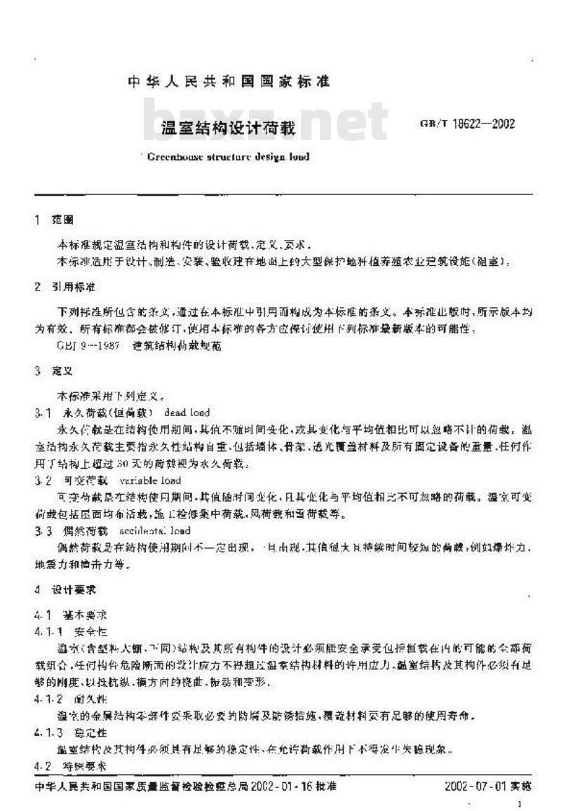 本标准规定了温室结构和构件的设计荷载、定义、要求。本标准适用于设计、制造、安装、验收建在地面上的大型保护地种植养殖农业建筑设施(温室)。 GB/T 18622-2002 温室结构设计荷载 GB/T18622-2002