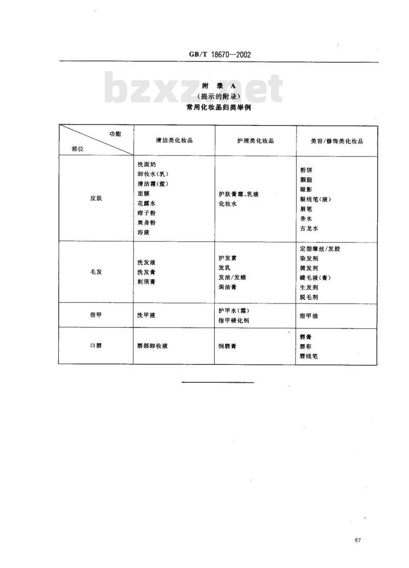 按照化妆品分类原则,化妆品可分为:清洁类化妆品、护理类化妆品及美容/修饰类化妆品。常用化妆品归类举例见附录A(提示的附录)。中华人民共和国国家质量监督检验检疫总局2002-03~05批准66