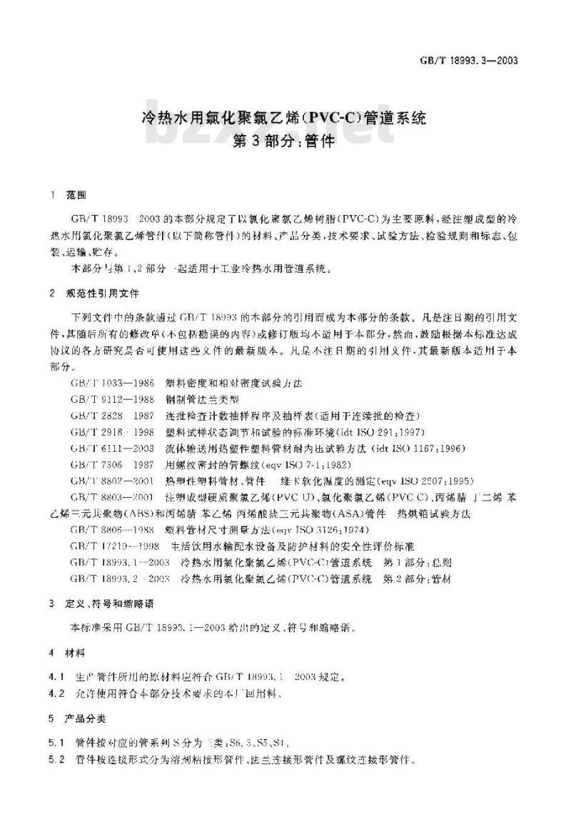GB/T189932003的本部分规定了以氧化聚氯乙烯树脂(PVC-C)为生要原料,经注塑成型的冷热水用氛化聚氮乙烯管件(以下简称管件)的材料、产品分类,技术要求,试验方法、检验规则和标志、包装、运输、贴存。