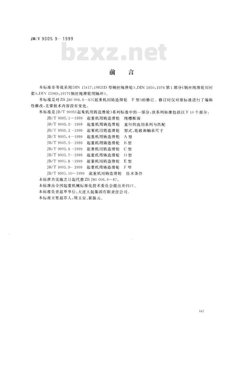 本标准非等效采用DIN15417:1982《D型钢丝绳滑轮》、DIN1850:1976第1部分《钢丝绳滑轮用衬套》、IDIN15069:1977《钢丝绳滑轮用隔坏》本标准是对ZB3J80006.9--87《起重机用铸造滑轮F型》的修订。修订时仅对原标准进行了编辑性修改,主要技术内容没有变化。本标准是JB/T9005《起重机用铸造滑轮》系列标准中的一部分,该系列标准包括以下10个部分:JB/T 9005. 1--1999