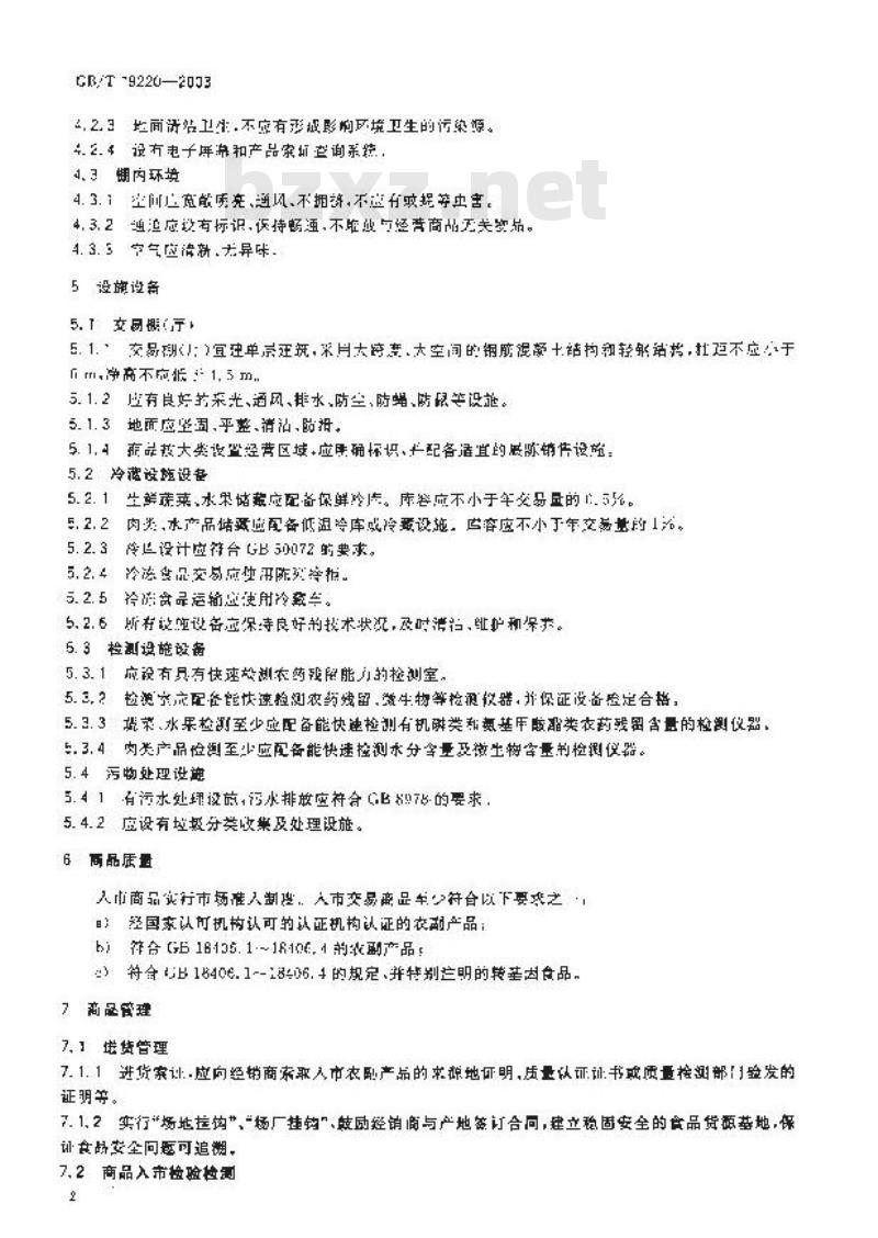 5.2.1生鲜蔬来,水果储载应配备保鲜冷片。库容应不小于年父品量的1.5%。5.2.2肉类,水产品堵氮盛配各低温库或冷最设施,容应不小于年交易量的1浴。冷设计应符合GB50072的要求。