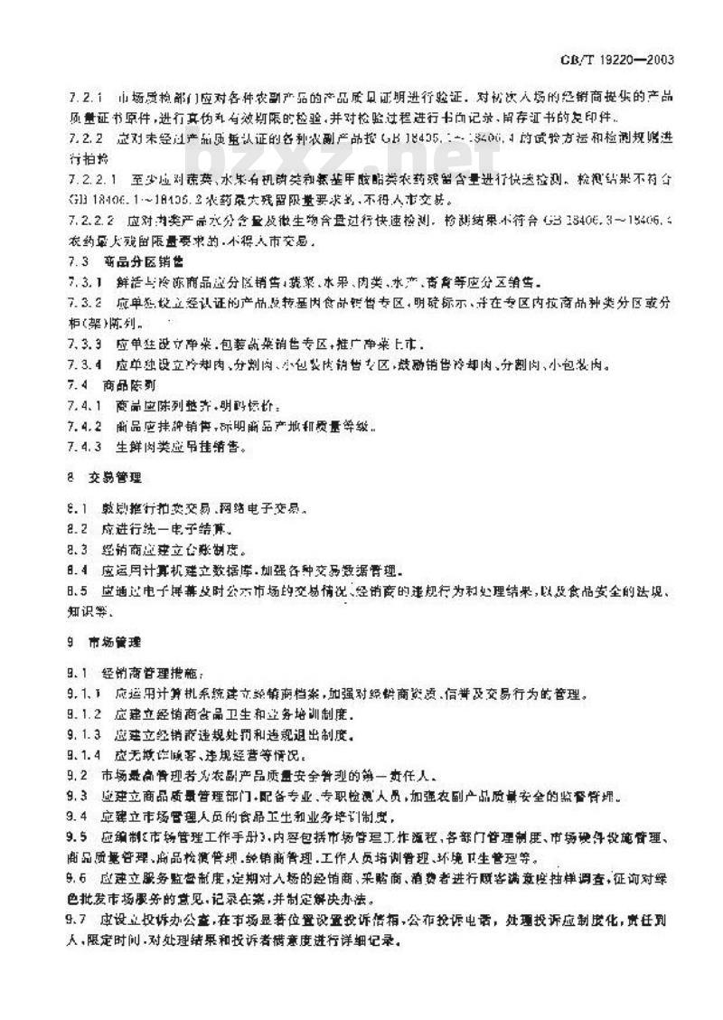 9.1.1底运用计算机系统连文龄辅商档案,加强对经销商察质.信普及交易行为的管理。9.1.2应建立经销商食品卫生和业务培训制度.9.1.3应建立经销宽违规处罚和造观退出制度。9.1.4整无热顾客、连期经营等情说。9.2市场最高骨现者为农副产品质量安全曾理的每一责任人,9.3应建立商品质量管理部门.配备专业,专职检测人员,加农副产品质量安全的监餐肾埋。9.4座建立市场受理人员的食品工生和业务培训制度,9.5应编制市场管理工作手册?内零包括市场管理丁作程,各部门管理制臣、市场硬许投施督理、面品质量咨理、商品检酒管理.经销商管理.工作人员培训骨现、环境生管理等。9,6应建立服务监督制度,定期对人的经销商,采贴商、消费者进行顾客满意度抽样调查,征询对绿色批发市场券的意见,记录在案,井制定解决办法。9.7应设立投诉办公益,在市场显著位置设置投诉倍相,公布投诉电话,好理投诉应制化,宽任到人,限定时.对处理结果和投诉者满意度进行详细记录。GB/T19220—20C3