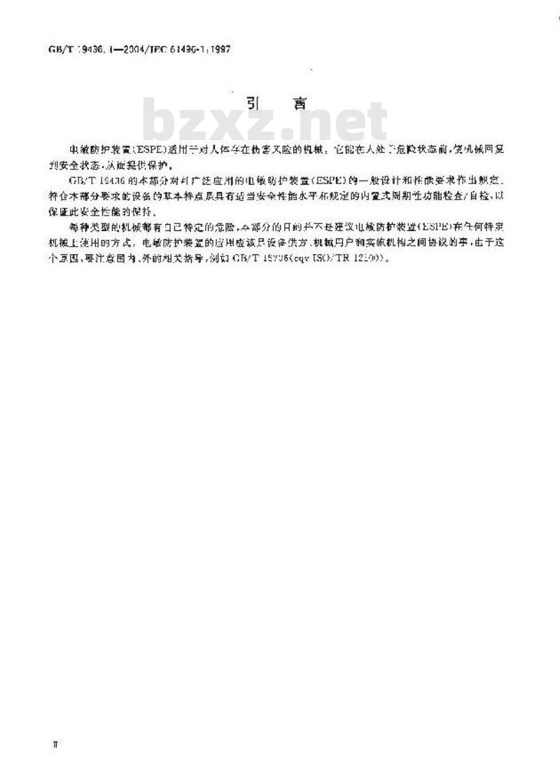 常2部分:使月有源光自防护器件(ACPLIs)设备前特染要求:第3部分:使用有源光漫反对器件(.A心PTTR改备的待殊要求:第4部分:基十规觉防护器件的特殊要求。本部分为GB/T19436的第1继分,等同采H1EL:61496--.1997《机继安全效配护装置第1部分“般要求和减验第一版,英文版】本部分中(OSSD(或(5SDs中下标表示复数,与IEC:标准一致。为便于使用,本部分能厂下列编辑左够收a】将适用于国乐标准的表球改为站用于我函标准的表述(包括标点符号))按/1.—0N0的规定,在本部分4.3.2和录小增划表的缩号和表;)将1EC61133-1:1997标准名称中的\挑撼安全\修改为本部分标准名称中的机披电气安全\。平部分的承九和录为规范性附录:本部分的附录心为资料性除录。本部由中国机械工业联合提出:本部分出国工业机域电系统标雅化技术委会(SAC/C然1)归口。本举分起草单位,中国,九川电器有限公司、北京机床研究所、国家机床质基监备检验中心,本部分主要起草人:除建国,阔武,黄龄,黄祖广,郑武,乃永友GB/T:9436,1—2004/TFC:6143G-1:T997引