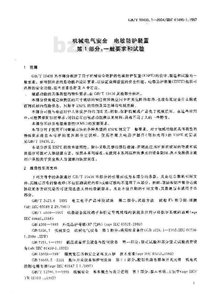 - GB/T 19436.1-2004 机械电气安全 电敏防护装置 第1部分:一般要求和试验