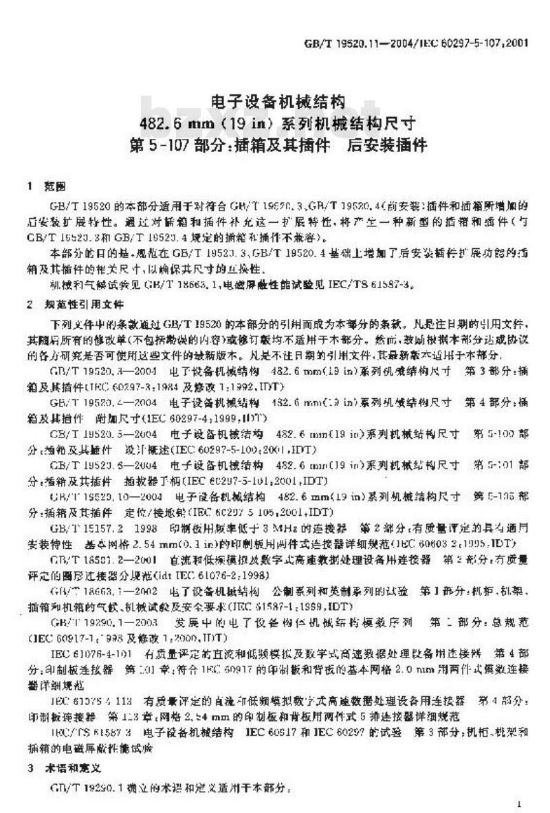 482.6mm(19in)系列机械结构尺寸第5-107部分插箱及其插件后安装插件GB/T19520的本部分适用于对符合GH/T156.3,GH/T19520.4前安装:插件和插箱所增的后安装扩展特性。通迁对箱和捕件补充这一扩展特性,将产至一种新型的插猎和面件(与CB/T15523.3和GB/T19523.4境定的拥箱机捕件不兼客>。本部尔的日的是+规范在GB/T1952:1.3,GB/T19520.4基础上增加了后安插长拟底央够的箱及其指件的相关尺十,以阐保共尺寸的且换性,机械和气能试收见GH/T18663.1,电磁屏性性能试验览IEC/TS61587-3。2规范性引用文性