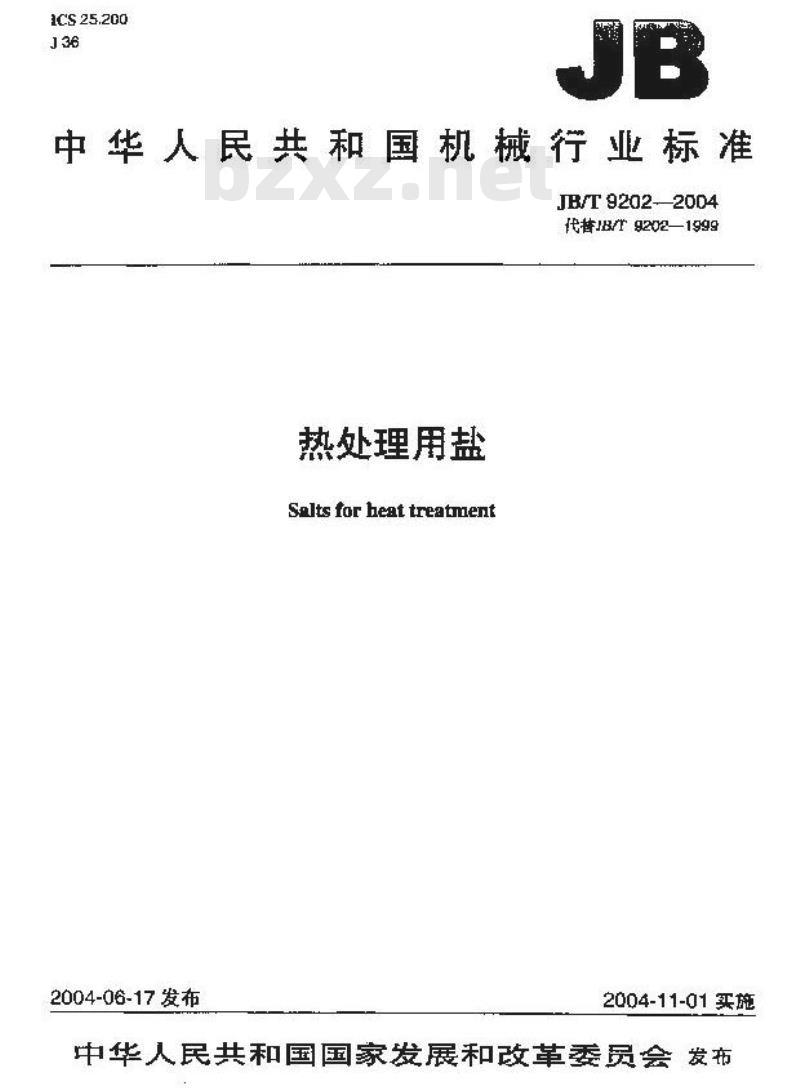 本标准自实施之日起,m9202一1999势处理用盐》作座。本标准由中机规工业联合会提山。本标准出全国热处理标准化技术委员会回:本标准主要起草单位:北京执电酬究所、北京航空材料研究院、核1业七一六热处埋材科厂本标准士要起草人;李俏、上广生:张榴全、马兰、胡心丽、鄂周俊、徐跃明,本标准所代替标准的历次版本发布情况为,ZBJ36(07-·1988.JB/T9202—J999,1范围