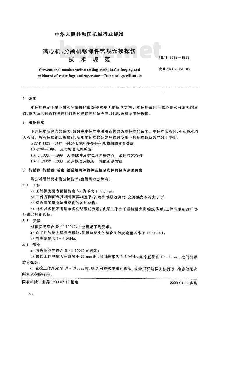- JB/T 9095-1999 离心机、分离机锻焊件常规无损控伤技术规范