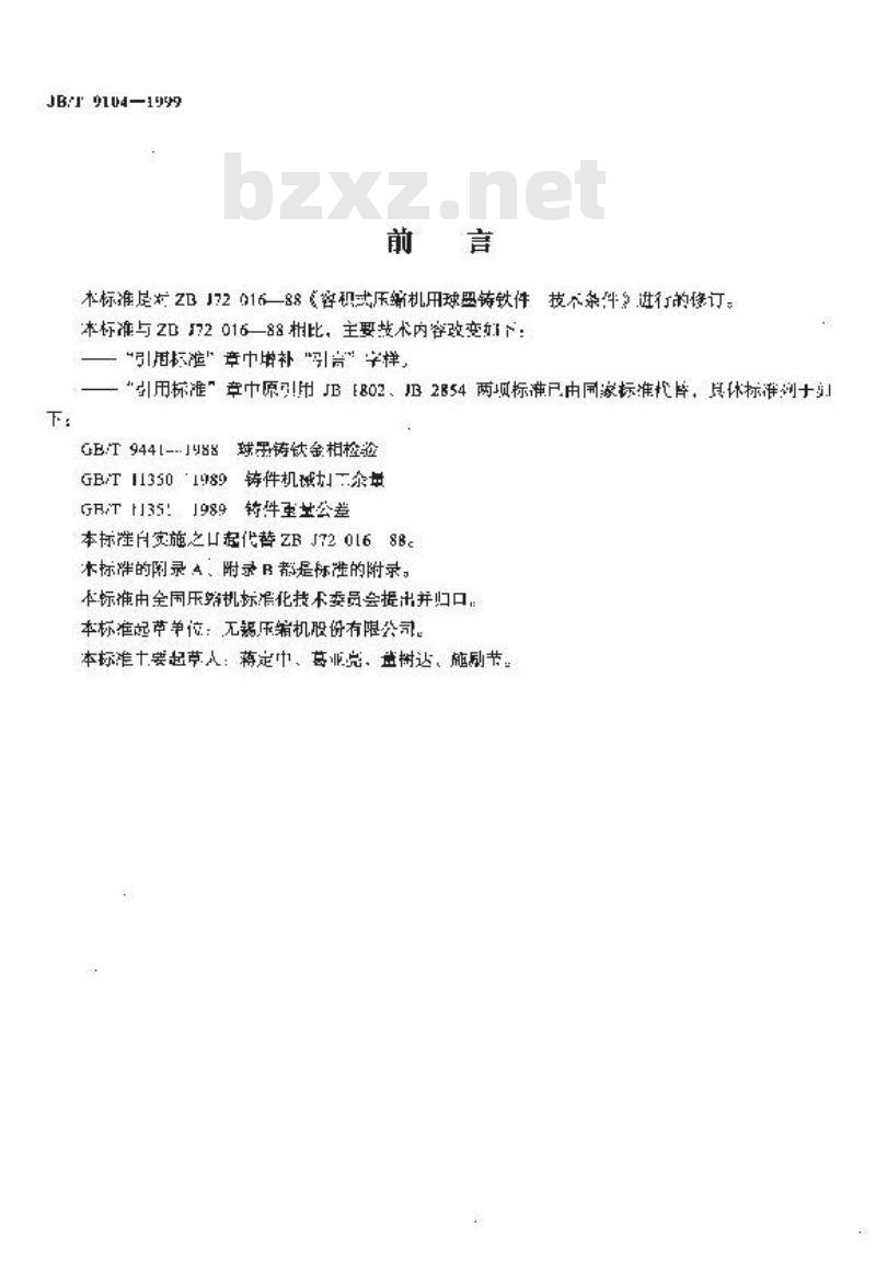JB/T 9104-1999 JB/T 9104-1999 容积式压缩机用球墨铸铁件 技术条件 JB/T9104-1999