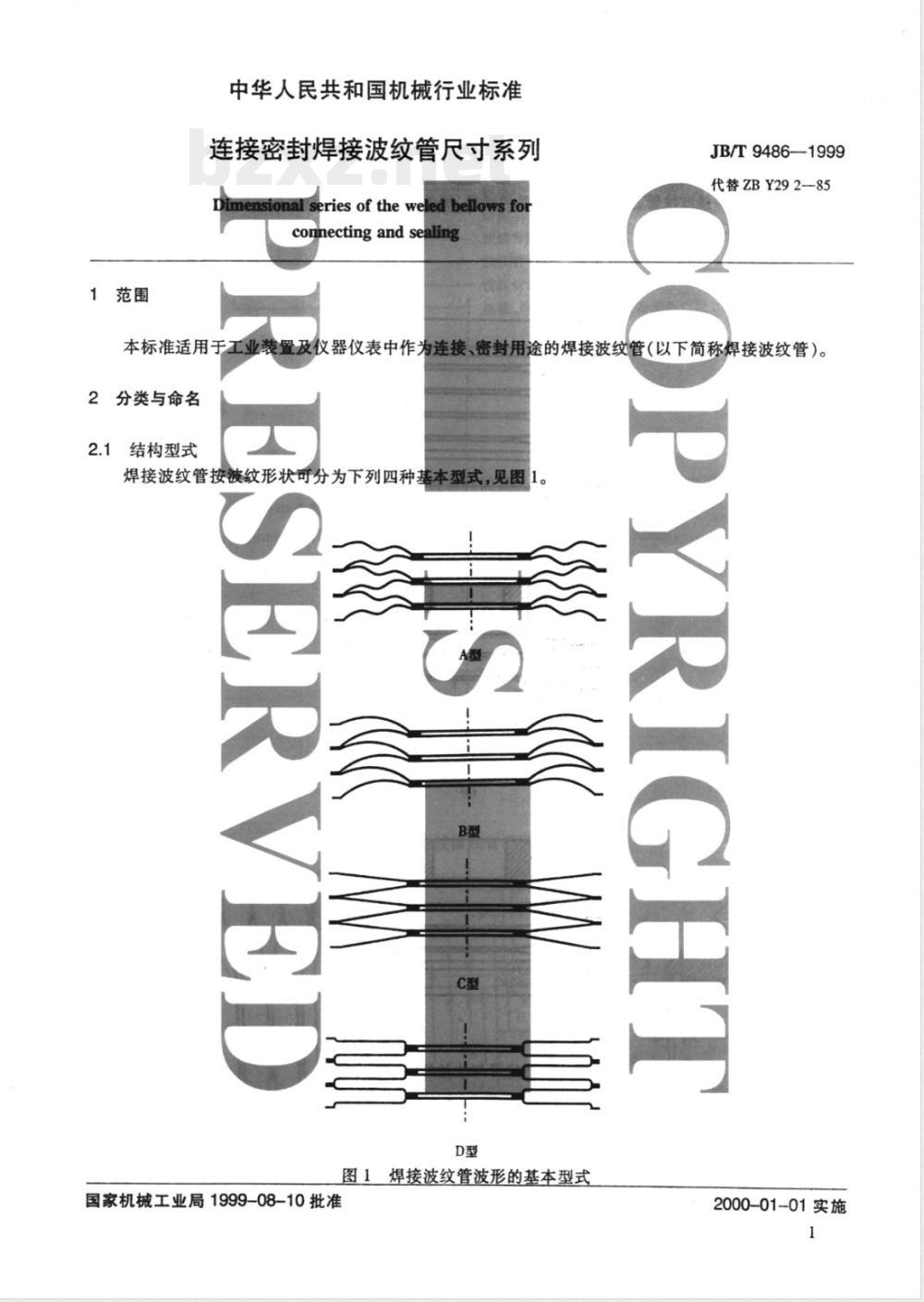 :尺寸系列》的修订。修订时,对原标准作了编辑性本标准是对ZBY29285《连接密封焊接波纹管修改,主要技术内容没有变化。本标准自实施之日起,代替ZBY292一85。本标准由机械工业部仪器仪表元器件标准化技术委员会提出并归口。本标准负责起草单位:沈阳仪器仪表工艺研究所、四川仪表七厂。本标准主要起草人:徐学峰、陈岩。1范围